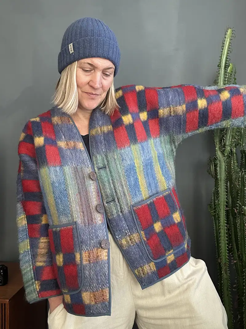 The craftsmanship of our blanket jackets is a proof to the love and skill of our artisans in Rudrapur, India. Each jacket is meticulously crafted from handwoven wool blankets. Ensuring that no two pieces are the same. These unique blankets not only highlights the individuality of each jacket but also underlines our commitment to sustainability.
