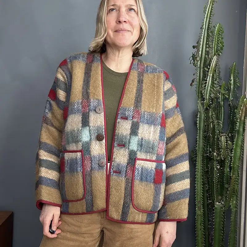 The craftsmanship of our blanket jackets is a proof to the love and skill of our artisans in Rudrapur, India. Each jacket is meticulously crafted from handwoven wool blankets. Ensuring that no two pieces are the same. These unique blankets not only highlights the individuality of each jacket but also underlines our commitment to sustainability.