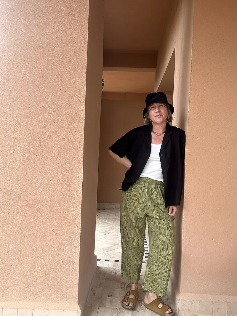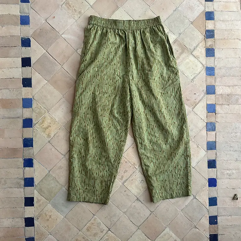 The “Camo” pattern is a hand-pressed interpretation of the natural world, created using traditional wooden blocks. Because each pair is hand block printed, the patterns carry a soft, organic rhythm that machine-made prints can’t replicate. Crafted from summer-weight organic cotton, they feel light as air but have enough substance to hold their unique shape.