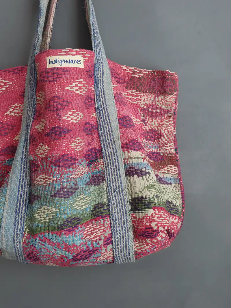 Our Kantha totes are a real nod to slow fashion. By repurposing vintage textiles, we give a second life to beautiful fabrics that would otherwise be tucked away or lost. Because each cotton tote bag is handmade in small batches using recycled materials, no two are ever exactly the same – the patterns, colours, and contrast linings are entirely exclusive to you.