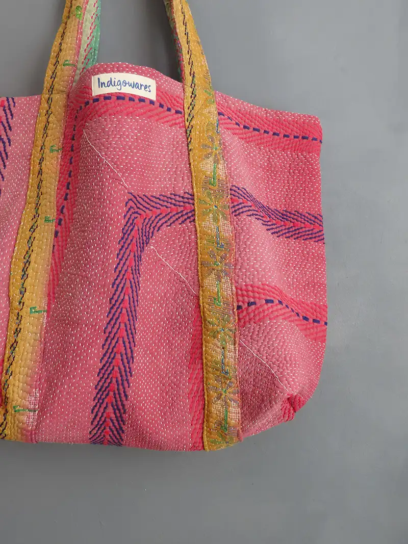 Our Kantha totes are a real nod to slow fashion. By repurposing vintage textiles, we give a second life to beautiful fabrics that would otherwise be tucked away or lost. Because each cotton tote bag is handmade in small batches using recycled materials, no two are ever exactly the same – the patterns, colours, and contrast linings are entirely exclusive to you.