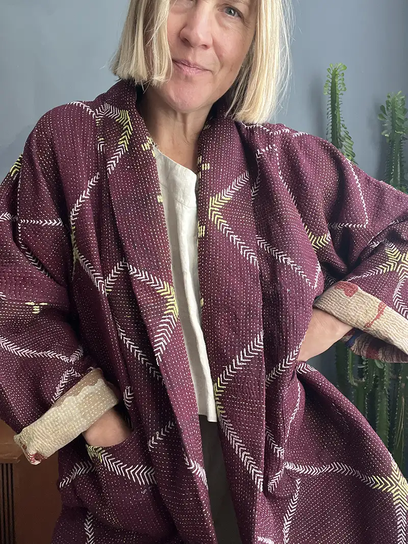 This long Indian Kantha jacket blends comfort, tradition, and everyday style. Each one starts with a vintage quilt from India, stitched by hand and full of colour and texture. No two jackets are ever the same.