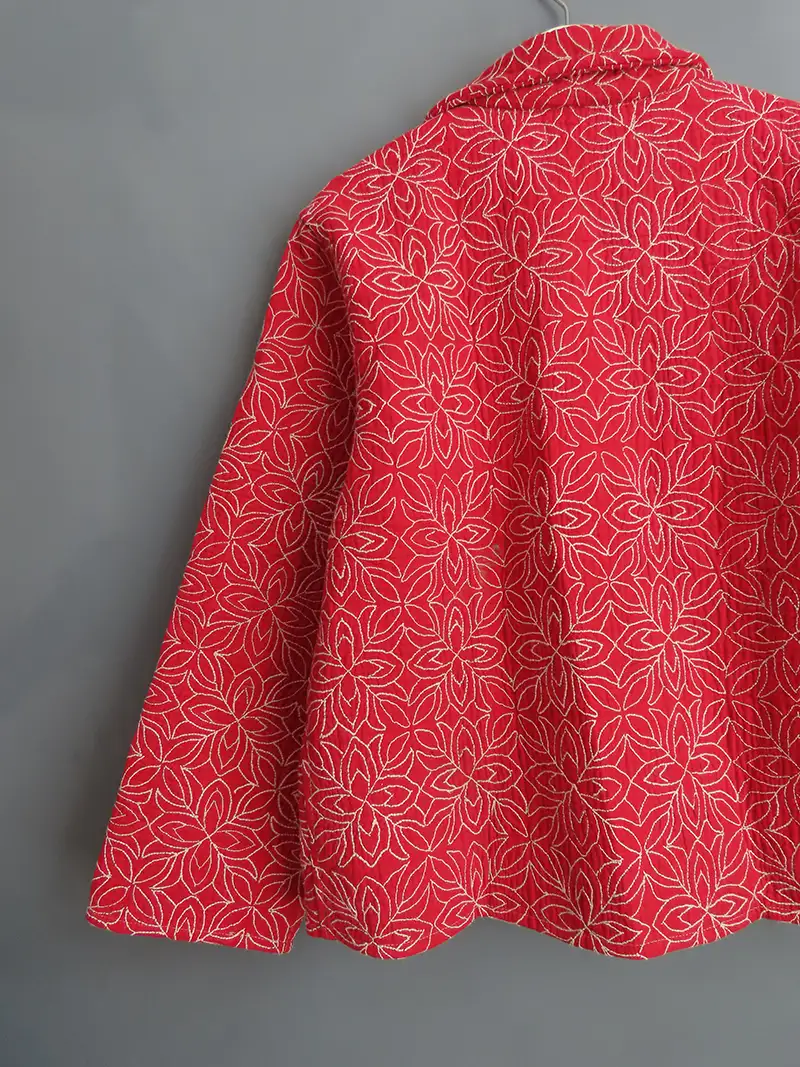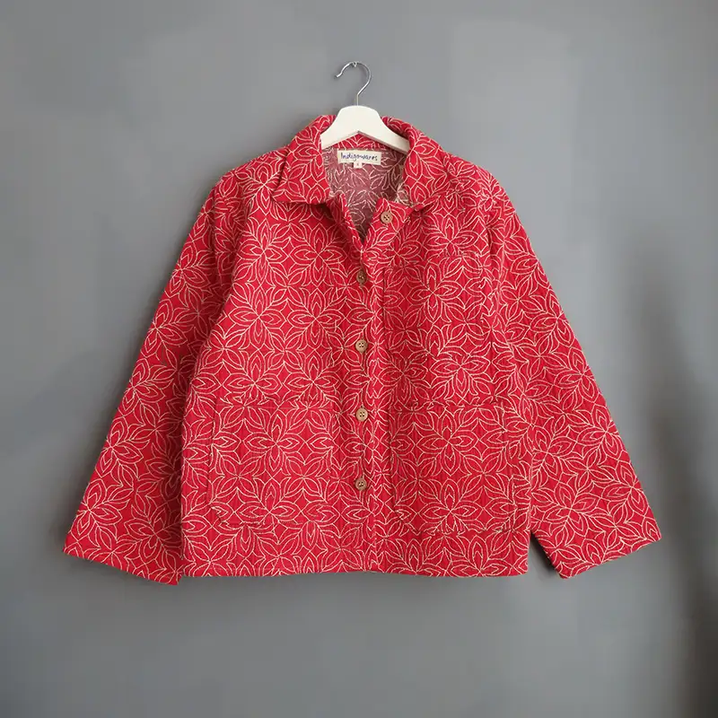 Because every quilt is different, no two jackets are ever the same. Patterns shift, colours vary, and each one features its own distinct kantha stitch style running across the surface.