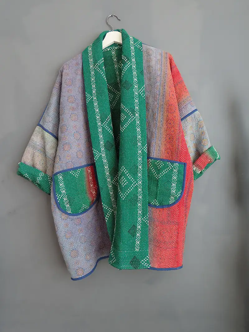 An oversized kantha coat made from vintage Indian quilts – each one a true original. This long, relaxed jacket is completely one of a kind, stitched by hand from pre-loved kantha textiles full of colour, texture, and history.