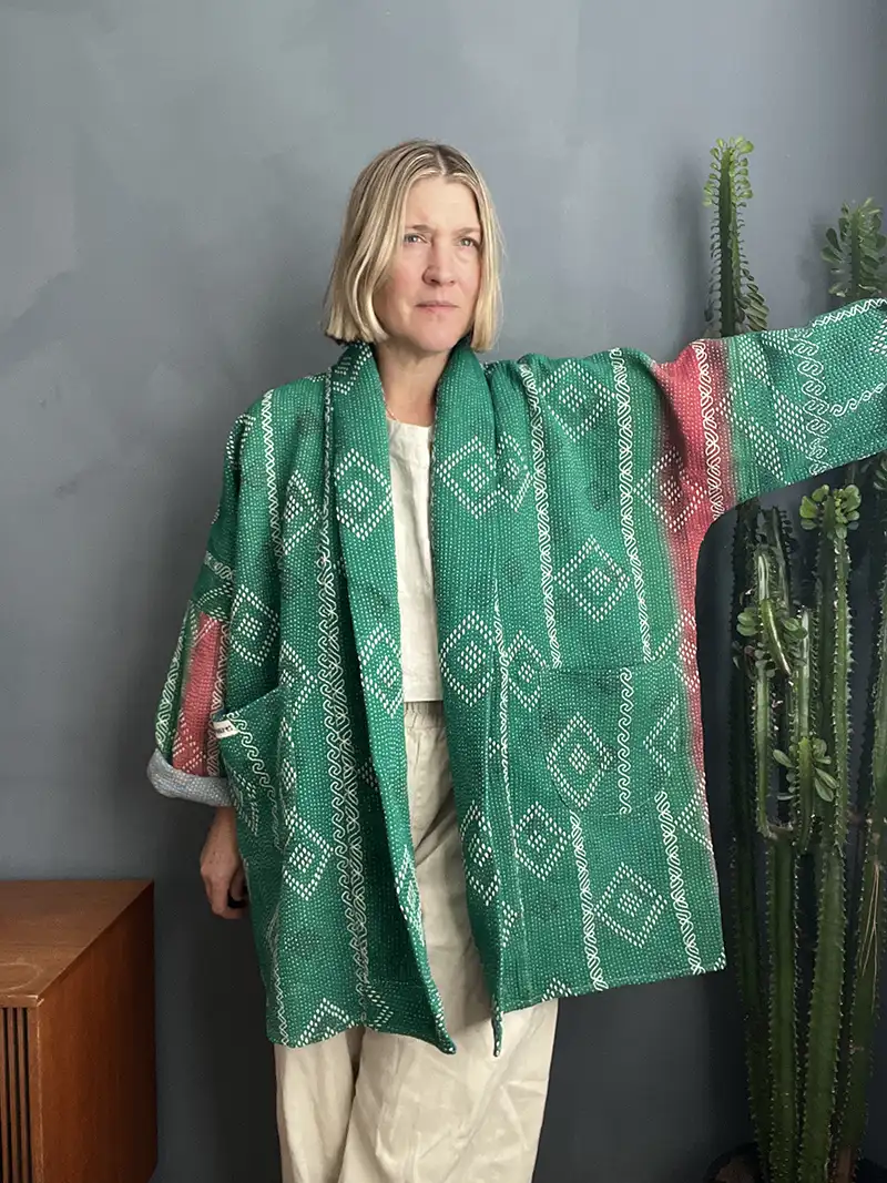 We source authentic vintage kantha quilts, each hand-stitched by women in India using layers of worn saris. These beautiful old textiles are given new life in a coat that honours their past and makes them wearable today.