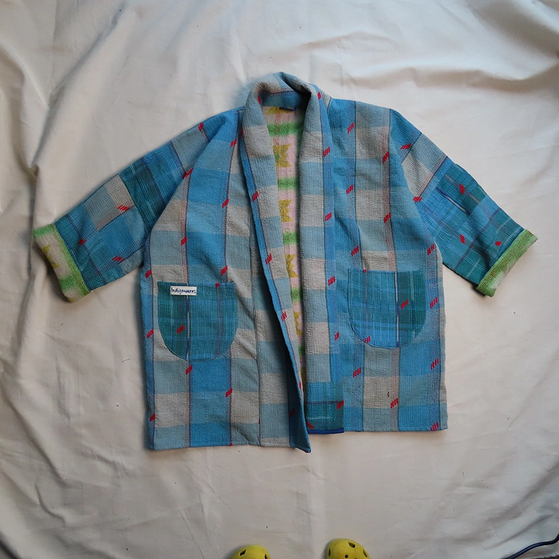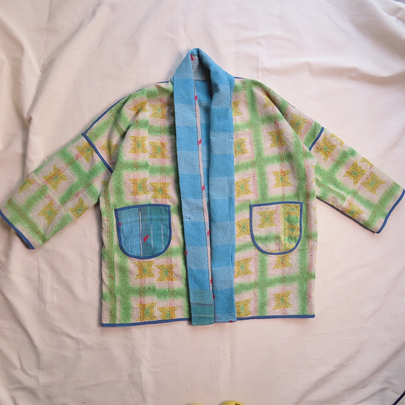 Two deep front patch pockets keep things practical. Fold back the sleeves to reveal a surprise lining of intricate, contrasting kantha patterns – each sleeve tells a different story. Every coat is made with care to highlight the unique hand-stitched details in each quilt.