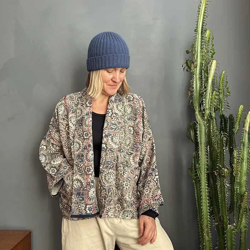 Because every quilt is different, no two jackets are ever the same. Patterns shift, colours vary, and each one features its own distinct kantha stitch style running across the surface.