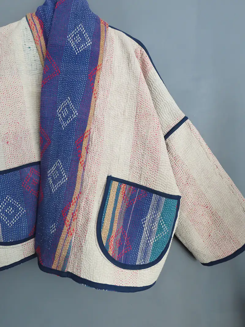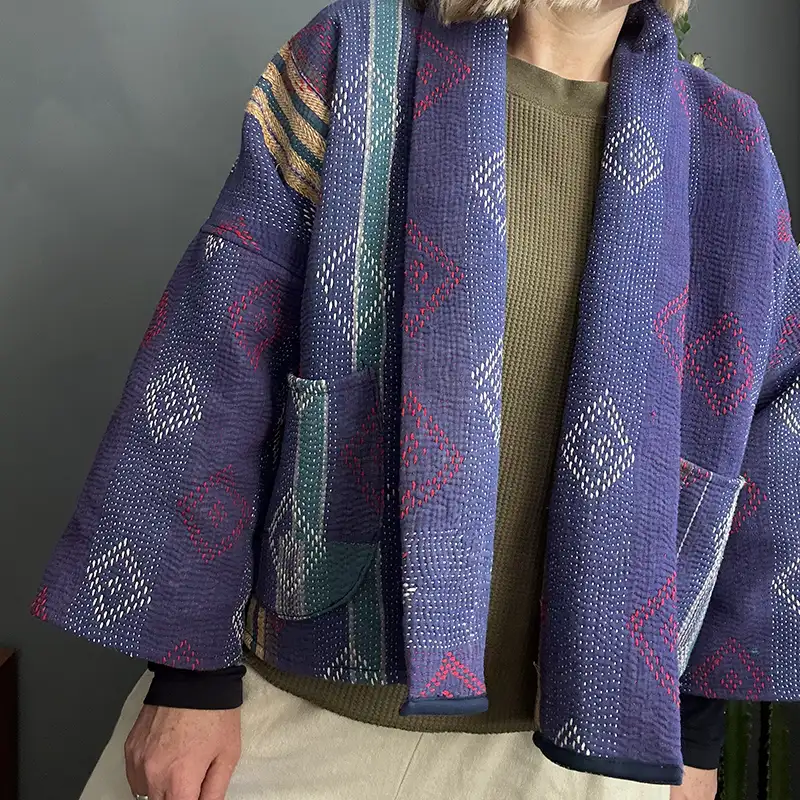 Because every quilt is different, no two jackets are ever the same. Patterns shift, colours vary, and each one features its own distinct kantha stitch style running across the surface.
