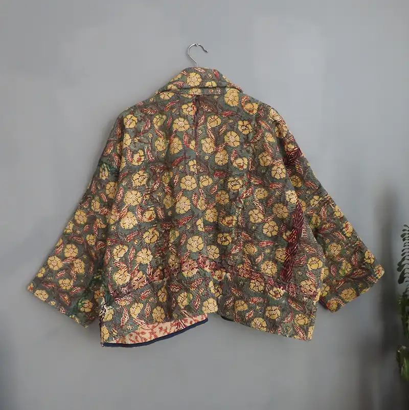 Because every quilt is different, no two jackets are ever the same. Patterns shift, colours vary, and each one features its own distinct kantha stitch style running across the surface.