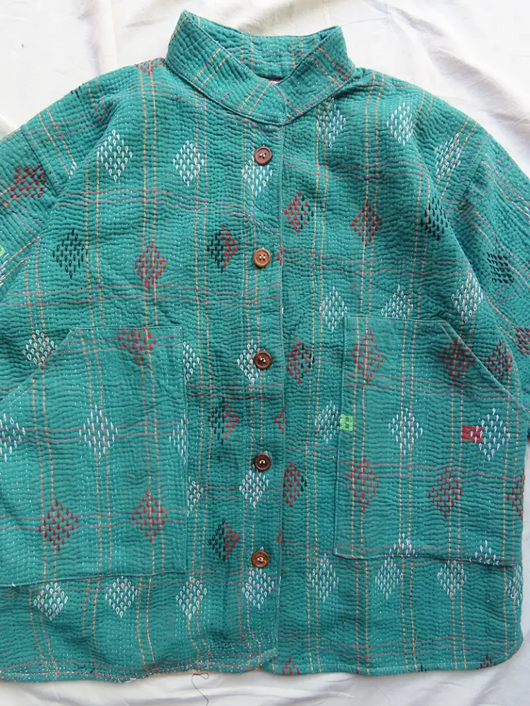 Because every quilt is different, no two jackets are ever the same. Patterns shift, colours vary, and each one features its own distinct kantha stitch style running across the surface.