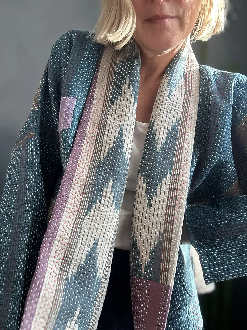 Because every quilt is different, no two jackets are ever the same. Patterns shift, colours vary, and each one features its own distinct kantha stitch style running across the surface.