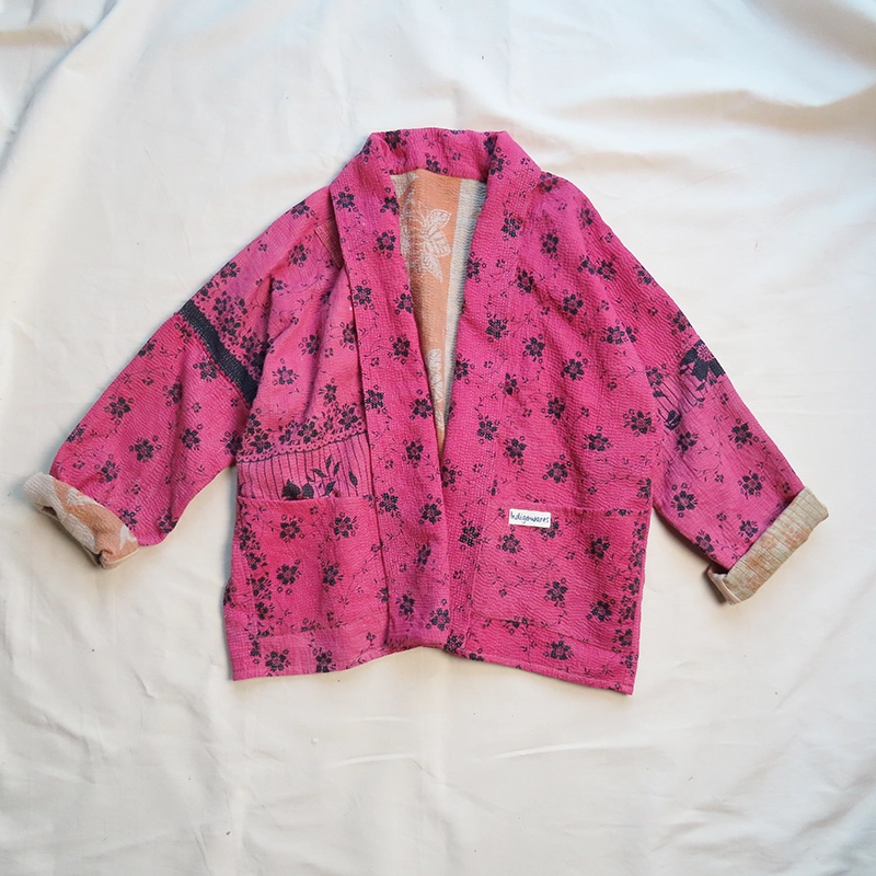 Each jacket begins with vintage kantha quilts, hand-embroidered textiles that are between 30 and 80 years old. These reclaimed layers carry history, texture, and soul.