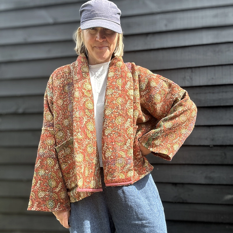 Because every quilt is different, no two jackets are ever the same. Patterns shift, colours vary, and each one features its own distinct kantha stitch style running across the surface.