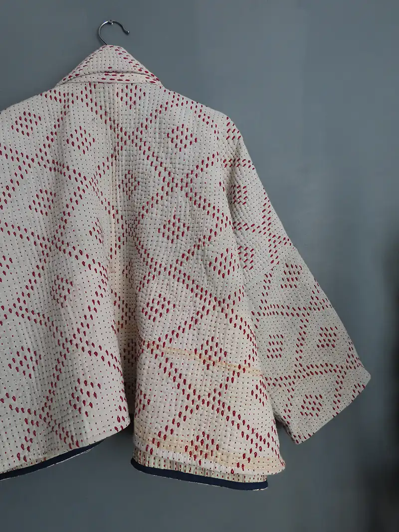 Because every quilt is different, no two jackets are ever the same. Patterns shift, colours vary, and each one features its own distinct kantha stitch style running across the surface.