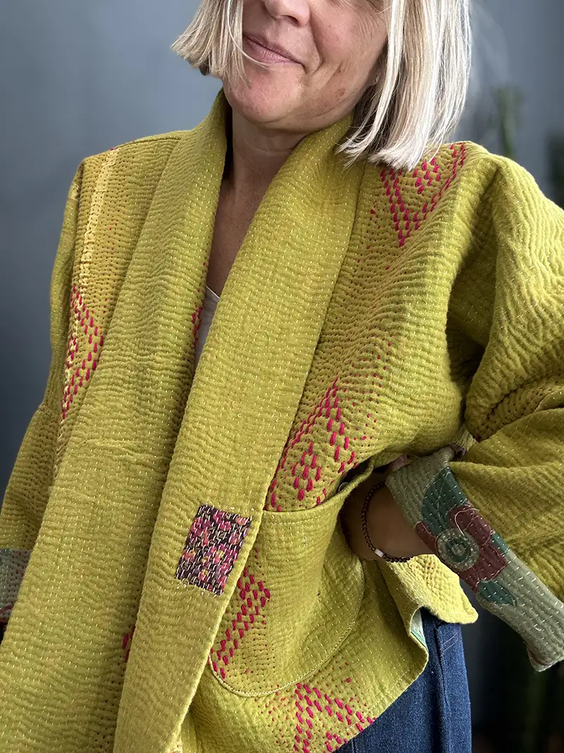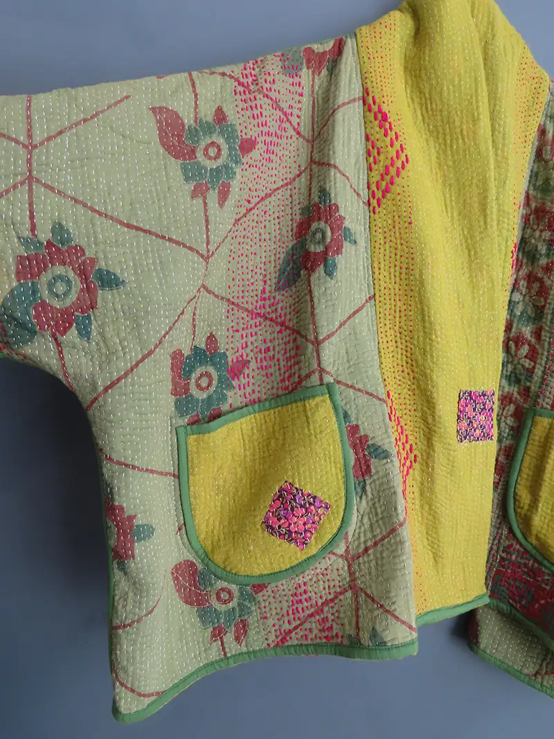 Because every quilt is different, no two jackets are ever the same. Patterns shift, colours vary, and each one features its own distinct kantha stitch style running across the surface.
