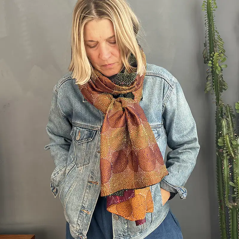Our Kantha scarves are a celebration of timeless artistry and sustainable design. Each scarf is hand-stitched from repurposed vintage Indian saris, using the centuries-old tradition of kantha embroidery. Rows of running kantha stitches flow across the fabric, creating subtle ripples of texture and holding together layers of history. Every piece carries the quiet beauty of this heritage craft – no two scarves are ever the same.