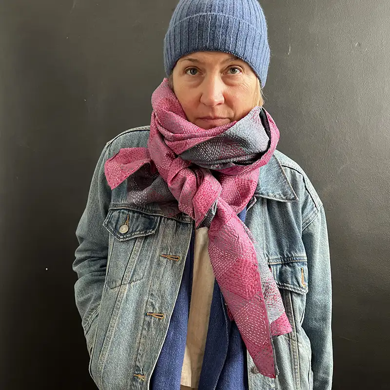 Our Kantha scarves are a celebration of timeless artistry and sustainable design. Each scarf is hand-stitched from repurposed vintage Indian saris, using the centuries-old tradition of kantha embroidery. Rows of running kantha stitches flow across the fabric, creating subtle ripples of texture and holding together layers of history. Every piece carries the quiet beauty of this heritage craft – no two scarves are ever the same.