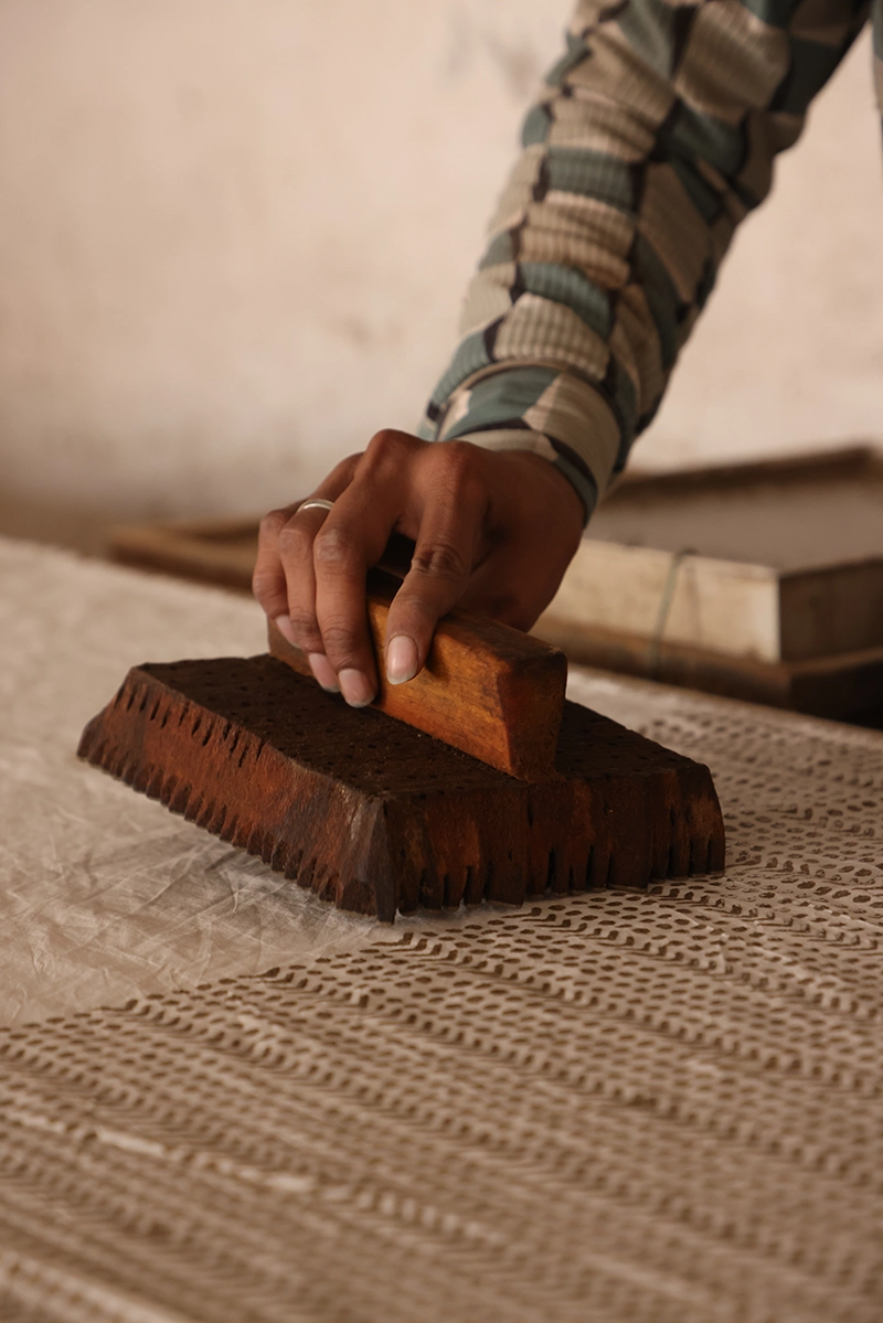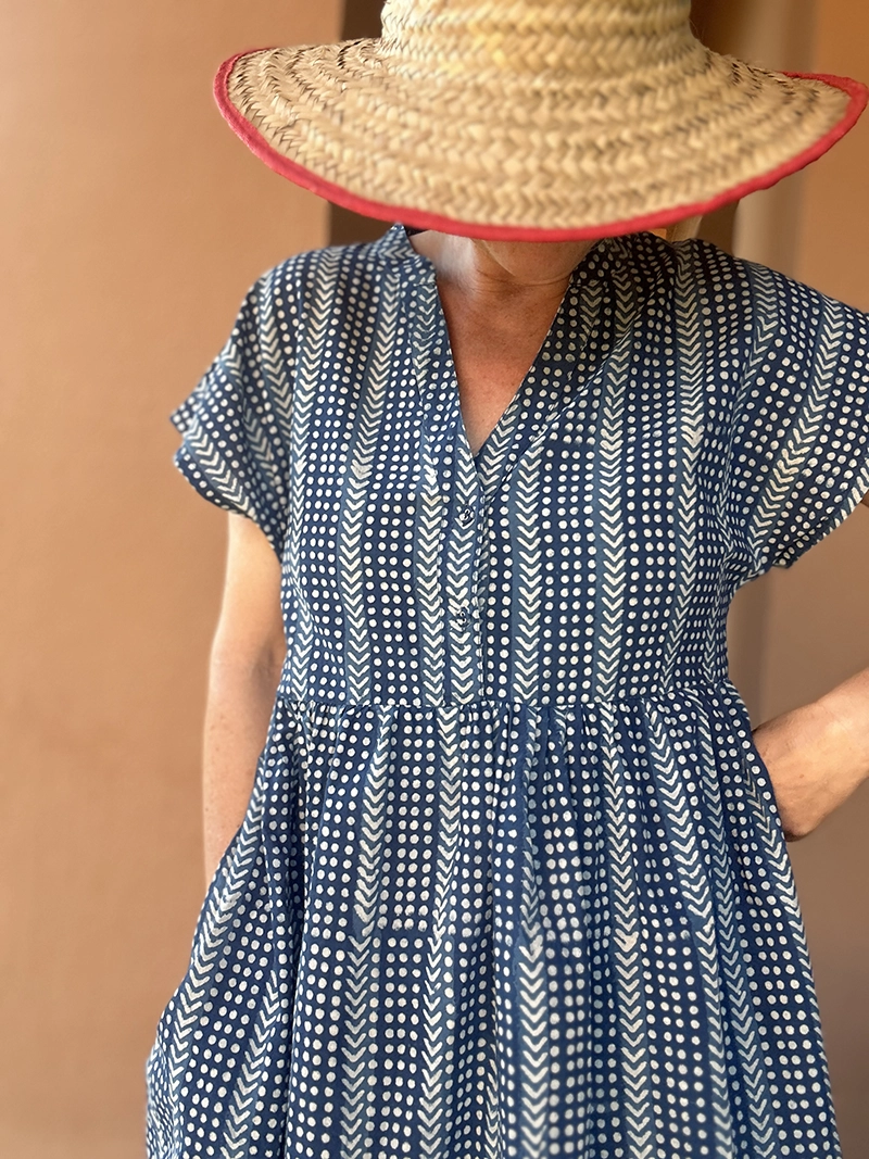 The block printing in this collection is specifically created using hand carved wood blocks and dabu mud printing techniques. Once the mud has dried in the hot sun, it is then dyed in indigo, dried again, then finally the cloth is washed to reveal the unique block printed patterns. Truly unique due to the block printed artistry.