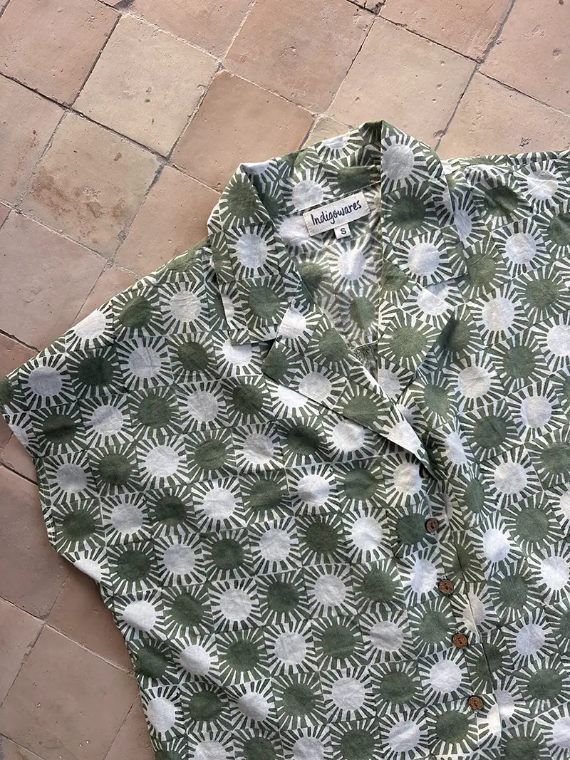Instead of factory mass-production, master artisans apply the Sunray pattern by hand using eco-friendly khaki green ink. Because of this manual process, the saturation and alignment vary slightly on every block printed organic cotton shirt. Consequently, these small inconsistencies mark the work of the human hand and ensure your garment is entirely unique.